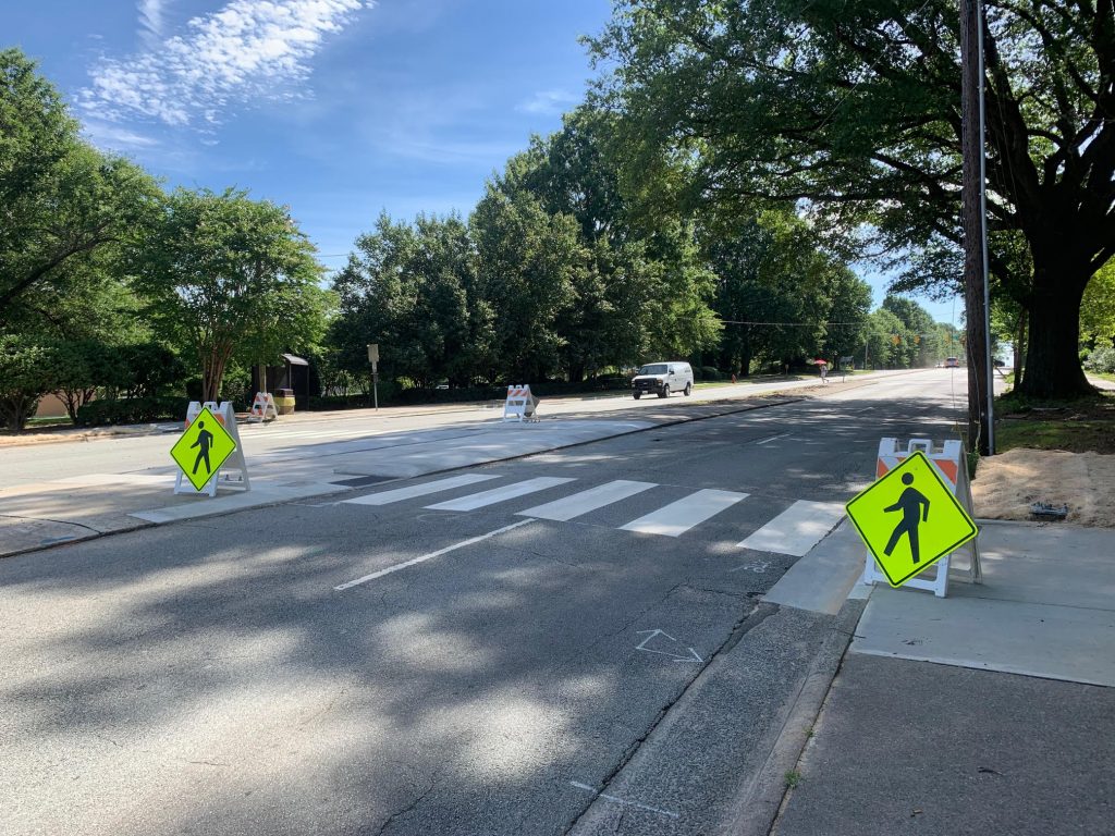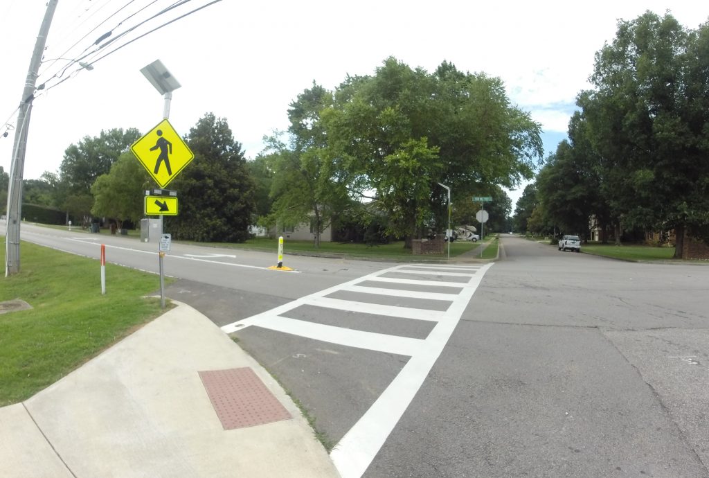 Huntsville’s demonstration project added more intensive improvements to an existing crosswalk on a high-speed road where very few drivers yield to people crossing and filled in a missing bike connection to a nearby greenway.