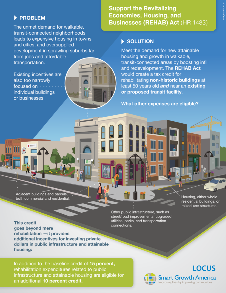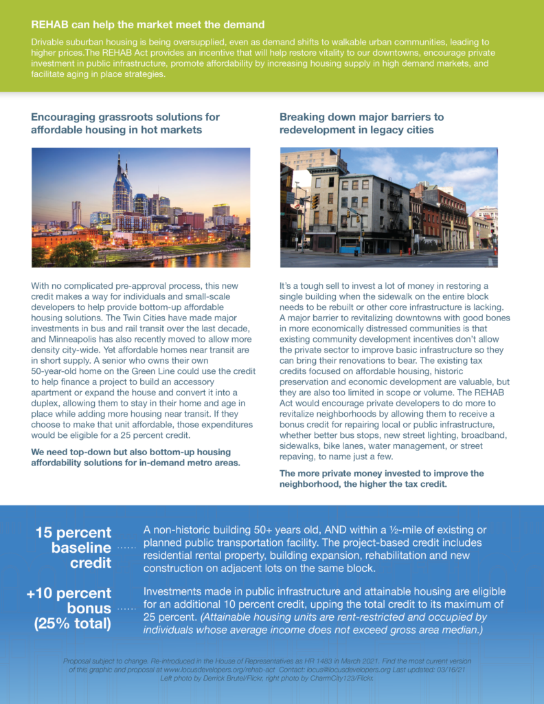 The REHAB Act (H.R. 1483) is a simple, straightforward way to help encourage new housing and businesses in the downtowns and other walkable areas where people want to be. This legislation can help provide the financing to local builders that is critical to closing the gap so they can help revitalize downtowns, upgrade deteriorating public infrastructure, and expand access to attainable housing. Redeveloping sites near transit is good, but only projects that provide new units of attainable housing and/or invest in public infrastructure—like better bus stops, new street lighting, sidewalks, bike lanes, rain gardens, street repaving, to name a few—can qualify for the maximum tax credit.