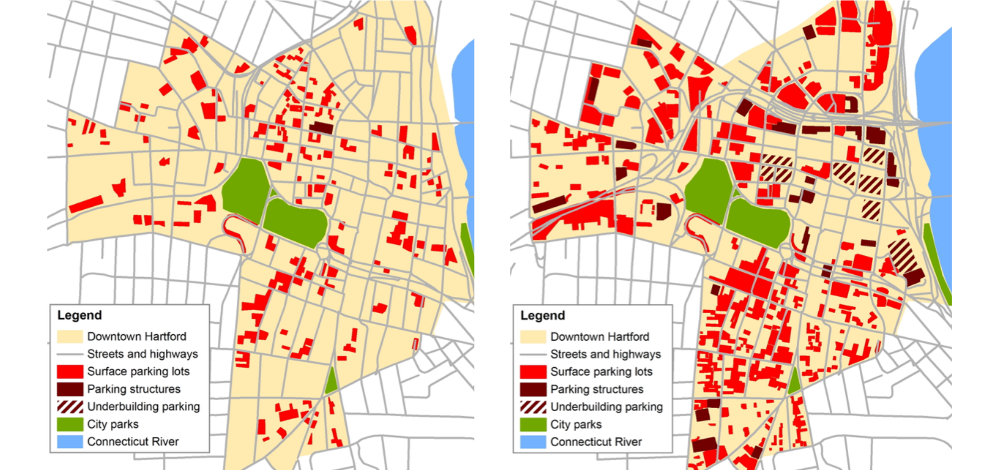 Hartford parking inventories: 1960 (left) vs. 2000 (right). Credit: Chris McCahill, SSTI.