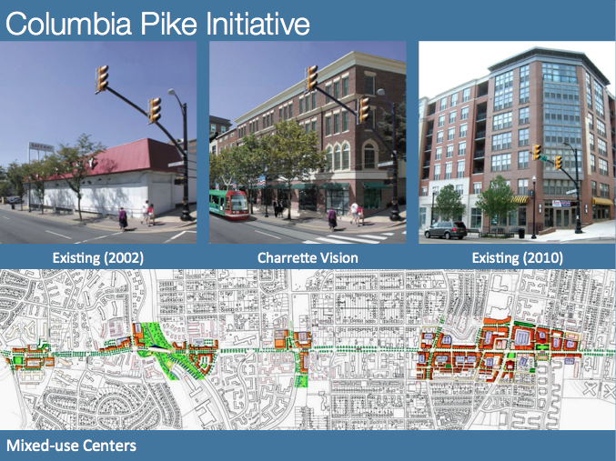 Amy/Chris: The Columbia Pike initiative was not dependent on BRT or light rail for success, but instead seen as an opportunity to grow ridership and capacity of what was already highly-used bus service. The charrette and planning were not specific on future investments in transit because the area was already densely populated—so it was more akin to “development-oriented transit.” We also didn’t need a shiny new streetcar to initiate redevelopment because we were looking for just enough property value appreciation to preserve the affordable housing that was already there.