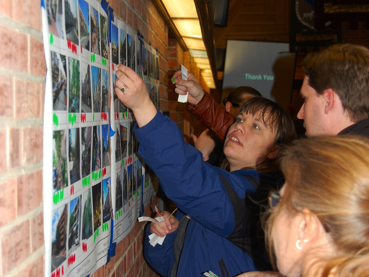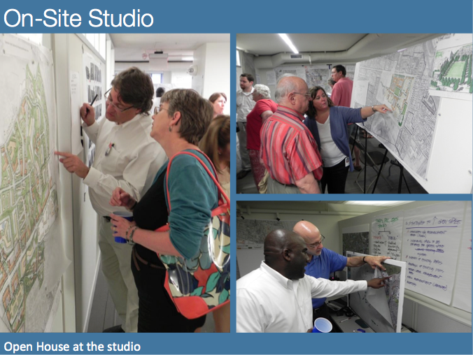 Bill then described the activities of the five-day Center City Vision Charrette: hands-on exercises and opportunities for residents to draw their ideas; technical meetings with transportation, building code, land use, and legal staff; public meetings; and abundant open-studio time for community members to observe the designers at work.
