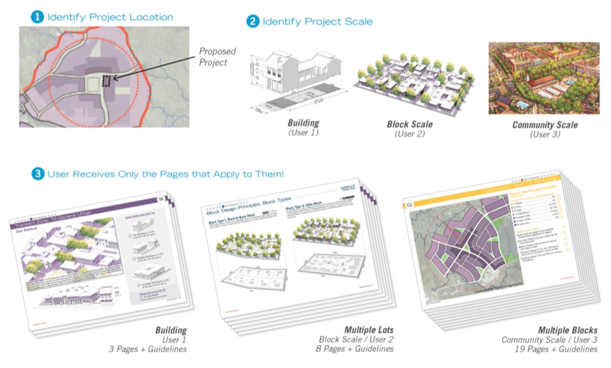 Conventional, use-based zoning codes are often heavy on text, short on illustrations, and use overly technical language. Good form-based codes are designed to make zoning approachable, concise, and understandable for everyone—a first-time homeowner, a developer, an architect, or a skilled planning professional. The layout should make navigating the document easy, and the outcome and steps in the decision-making tree and the development outcome should be clearly defined. All technical terms are spelled out in plain english and graphics and images are plentiful to convey the intent—a picture is worth a thousand words, especially when talking about form.