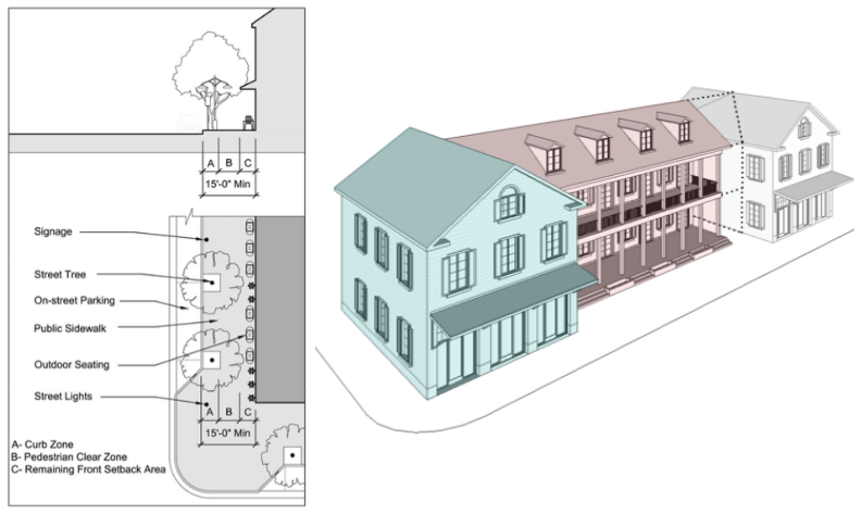 Left: Commercial use streetscape for Delray Beach. Right: new buildings must match the size, scale, and style of adjacent structures. Pictured here is a style of building known as the “Florida Vernacular” and how it might be integrated with existing structures. (Images: Treasure Coast Regional Planning Council)