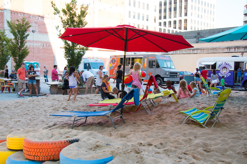 “Once the equipment was returned, there was an outcry from parents to continue programming and events. So we got a whole bunch of tires and painted them, laid them down, stacked them up, and then we got this huge amount of sand with beach umbrellas and chairs. Now we have a beach in downtown Wichita.”